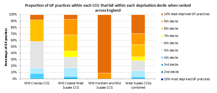 | Deciles | NHS Crawley CCG | NHS Coastal West Sussex CCG | NHS Horsham and Mid Sussex CCG | All West Sussex GPs |